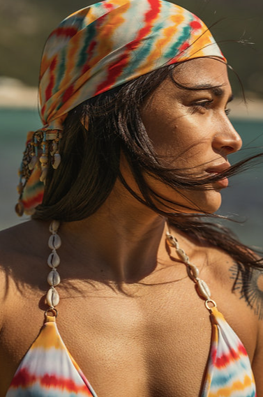 Parte de baixo de cinta média. Fitas de licra de amarrar de lado para ajustar a cada corpo. Búzio nas pontas das fitas.